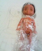 次にラップで髪や体をカバーして、薄いリキテックスで下書き。